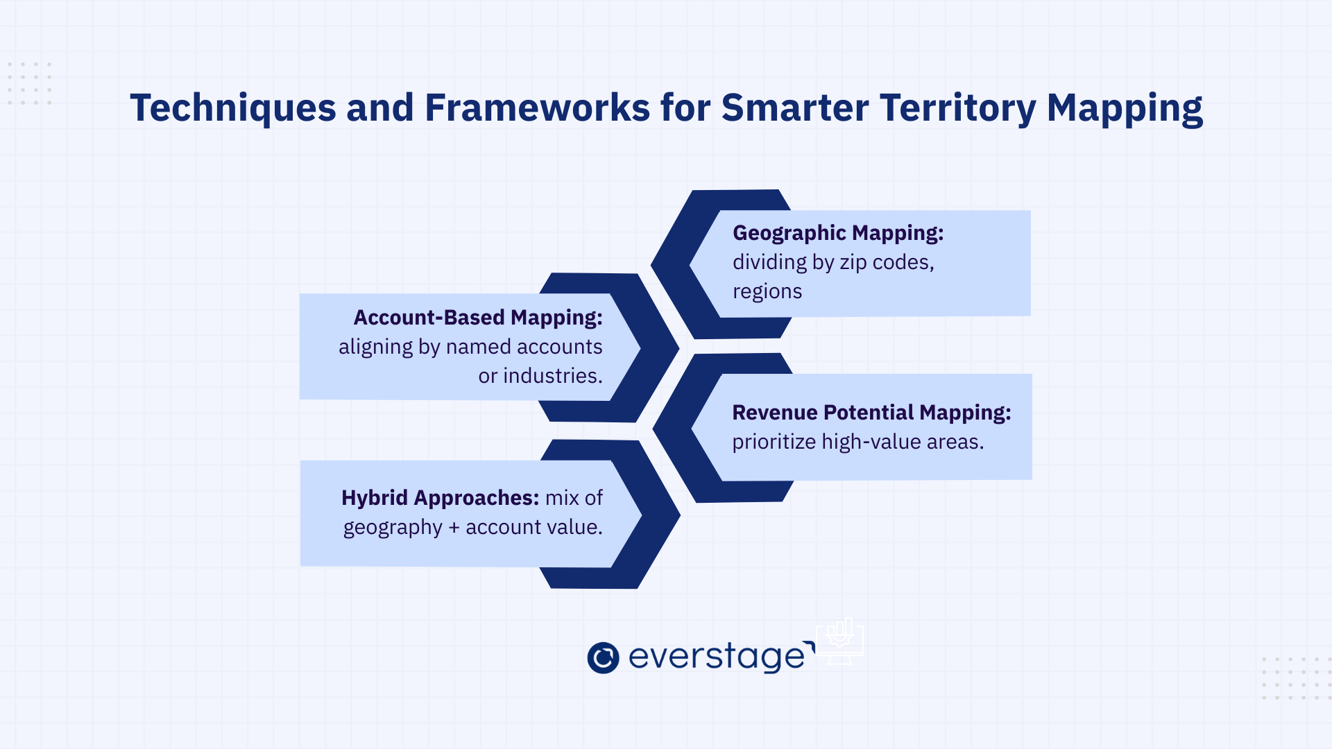 A hybrid approach combines the strengths of geographic and account-based mapping, using both geographical divisions and account value as factors in territory design. This method is ideal for businesses that have diverse customer bases across multiple regions but still want to focus on high-revenue opportunities.